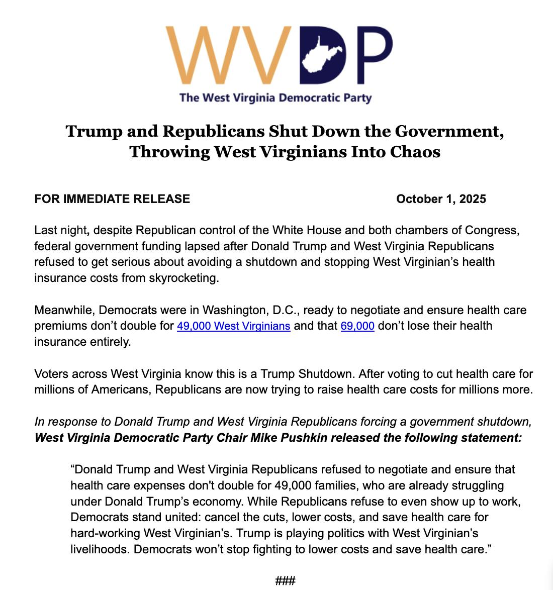 In response to Donald Trump and West Virginia Republicans forcing a government shutdown, West Virginia Democratic Party Chair Mike Pu