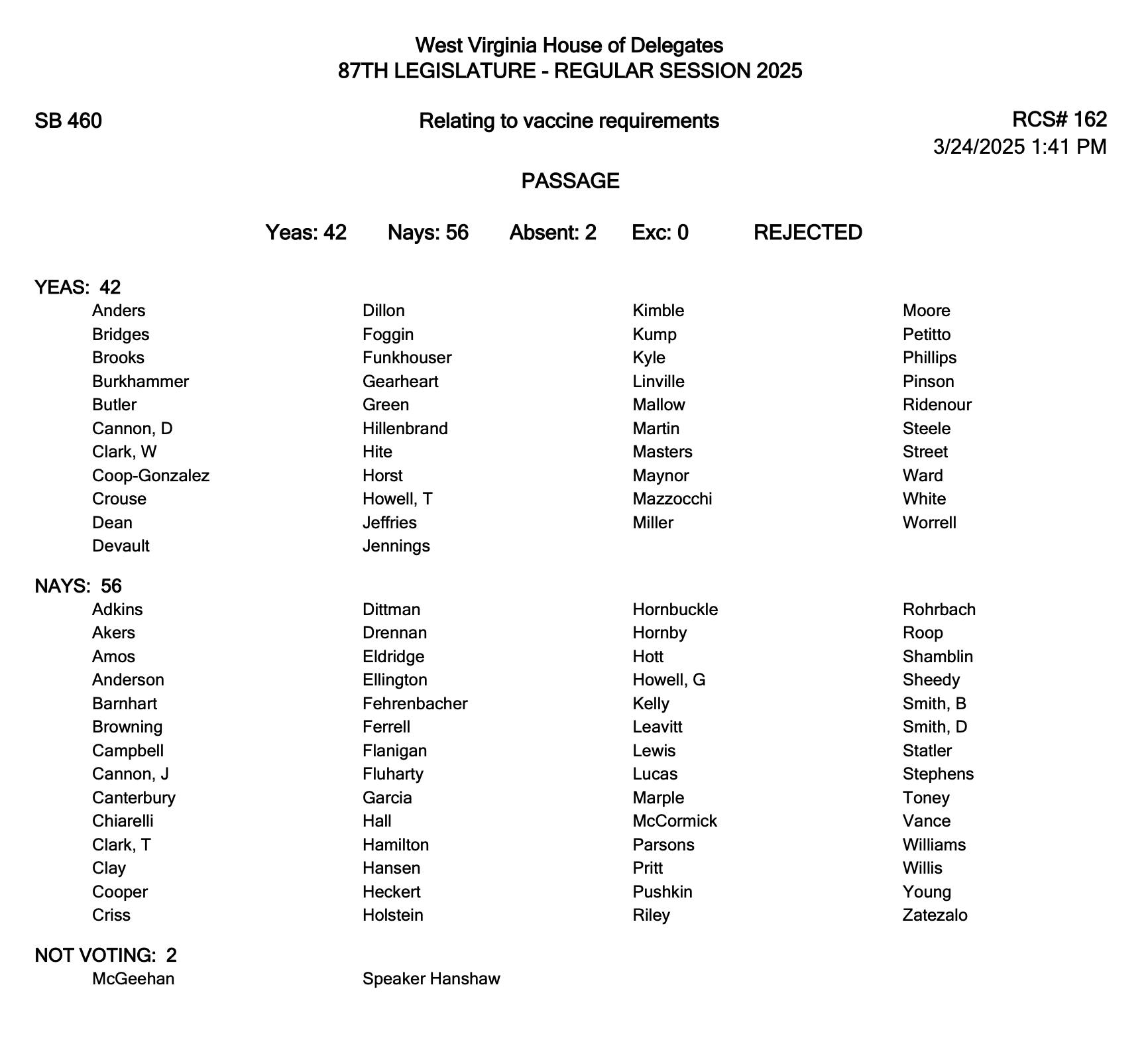 West Virginia Democrats Praise Bipartisan House Vote Defeating Governor Morrisey's Dangerous Immunization Exemption Bill, Urge Immediate Rescinding of Executive Order